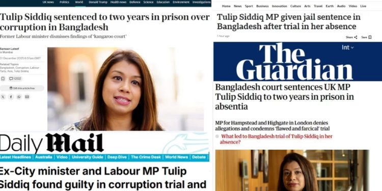 ব্রিটিশ সংবাদমাধ্যম বিবিসি বলছে—‘বিনা উপস্থিতিতে বিচার শেষে বাংলাদেশে টিউলিপ সিদ্দিক এমপিকে কারাদণ্ড’। ফিনান্সিয়াল টাইমস শিরোনাম করেছে ‘সাবেক ব্রিটিশ মন্ত্রী টিউলিপ সিদ্দিকের বাংলাদেশে দুই বছরের কারাদণ্ড’।